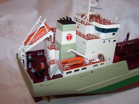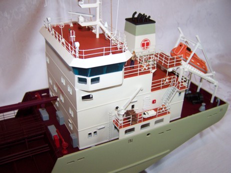 Etched brass details supply stanchions, walkways and deck fittings add the truly professional touch to this hard working merchant ship model. The complicated deck piping is assembled from styrene plastic tube and completed with all the valves, wheels and vents in metal, and using a 3 colour printed layout on the tank deck that lifts off as a complete unit for vast amounts of access to the hull.